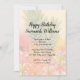 Hawaiian themed, custom birthday party invitation template. Bold script font at the top wishes the birthday gal a happy birthday, with party info easy to personalise in paragraph form. A background full of typical tropical finds include pineapples, hibiscus, and plumeria flowers in beautiful muted pink, yellow and green colours. The bracket shape is easy to change, and reverse holds another scene from the tropics with palm trees and ocean view.