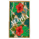 Pretty Hawaii themed gift small gift bag. It features a jungle leaves and fern pattern with red hibiscus flowers and the word "ALOHA" in white. The background is gold.