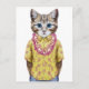 This design features a portrait of cat in a summer shirt and Hawaiian lei.