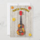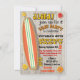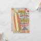 Super fun Hawaiian Luau Birthday Party invitations with a surf board and hibiscus flowers against a weathered wood background. The back features a hand painted wooden ukulele. Hand drawn illustration by McBooboo.