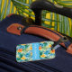 Custom luggage tag shown with a very tropical Hawaiian print with text.