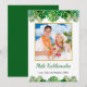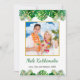 This fun, modern holiday card design features lush tropical beach foliage on the front, including palm fronds and monstera philodendron leaves, decorated with glowing multicolored lights, at the top and bottom. In the middle is a customizable gold-edged square photo that you can replace with your own. Below the photo are two customizable text lines, including the greeting "Mele Kalikimaka," the Hawaiian way to say Merry Christmas. You can personalize this design with your own greeting, name and year, or other text of your choice. The back of the card is dark green with a pattern of tiny festive gold dots that match the picture frame.