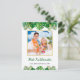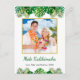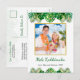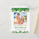 This fun, modern holiday postcard design features lush tropical beach foliage on the front, including palm fronds and monstera philodendron leaves, decorated with glowing multicolored lights, at the top and bottom. In the middle is a customisable gold-edged square photo that you can replace with your own. Below the photo are two customisable text lines, including the greeting "Mele Kalikimaka," the Hawaiian way to say Merry Christmas. You can personalise this design with your own greeting, name and year, or other text of your choice. The back of the card includes a customisable return name and address, message, and signature in green and black text, along with a subtle foliage overlay that matches the front of the card.