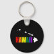 The name of the state of Hawaii in rainbow colours, along with black and white shape of the Hawaiian islands.