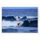 Surfers ride waves off of the coast of the Big Island of Hawaii. On the back of the card, a female surfers rides a board onto the beach.