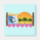 Colourful Hawaiian surfing graphic, sunset with hibiscus flowers, tiki statues, and palm trees.