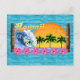 Colourful Hawaiian surfing graphic, sunset with hibiscus flowers, tiki statues, and palm trees.