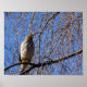 A hawk sits in a bare weeping cherry tree on a bright winter's day.