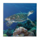 This beautiful tile features the critically endangered Hawksbill Sea Turtle, distinguished from other sea turtles by its sharp, curving beak, swimming in the blue waters of the Coral Sea on Australia's Great Barrier Reef.
