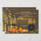 A vibrant, fall invitation that's perfect for any age birthday. It features a farm vehicle with a sign that reads "hay rides". There are corn husk bundles, pumpkins and fall leaves on the ground.