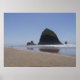 Photo of Haystack Rock, Cannon Beach, Oregon on a beautiful sunny spring day. The Oregon landmark stands in front of a clear blue sky and casts its reflection on the shimmering wet sand below. As the waves break on the shoreline a couple and their dog take a romantic walk along the beach in the distance.