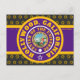 Postcard black with purple, gold and white concentric-circles design above a purple and gold rectangle with "HOLLYWOOD, CALIFORNIA CENTER OF THE UNIIVERSE" with Y-NOT-ME logos in the background. This design is a shout-out to Hollywood, California the movie capital of the world.