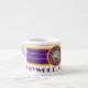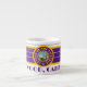 Espresso Cup 6oz. white with purple and gold concentric-circles design with "CENTER OF THE UNIVERSE" and "HOLLYWOOD, CALIFORNIA" at the bottom. With the Great Seal of California in the centre. This design is a shout-out to the incomparable city, Hollywood, California.