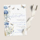 A pretty "He Gives Me Butterflies" bridal shower invitation with blue hydrangeas, butterflies and calligraphy font.