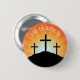 Easter pinback button / pin / badge featuring three crosses as silhouettes against a sunrise background. Text "He is risen".