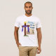 Celebrate the resurrection of Jesus Christ with this great Easter shirt! Graphic is a drawing of the (assumed) actual tomb of Jesus. In front, there is a cross with purple fabric and a crown to indicate that Jesus has returned to His royal and supreme place in the universe.