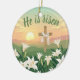 Celebrate the true meaning of Easter with this beautiful keepsake ornament that features a beautiful watercolor resurrection morning sunrise, A cross draped with a white cloth and lily of the valley flowers. There is also text that reads, " He is risen." All text on the back can be edited and personalized with your own message or omitted.