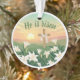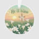 Celebrate the true meaning of Easter with this beautiful keepsake ornament that features a beautiful watercolor resurrection morning sunrise, A cross draped with a white cloth and lily of the valley flowers. There is also text that reads, " He is risen." All text on the back can be edited and personalized with your own message or omitted.
