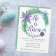 A beautiful religious Easter party invitation decorated with a lovely purple and green floral wreath. The interior reads He is Risen and the text below contains details for your dinner or lunch gathering to celebrate Jesus Christ with family and friends on Easter Sunday.