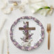 These Easter themed napkins have a pink and purple spring flower wreath borders along the edge on a bright white background. In the centre is a cross with a Lamb and a spring floral bouquet.