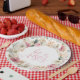 This Easter themed paper plate has pink hand lettering in the centre that says "He is Risen." A pink and white spring flower wreath borders the edge.