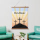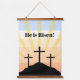 The vivid colours and crisp lines of the design are printed on soft, lightweight polyester, ensuring a visually impactful display on any wall. The poignant silhouette of the crosses serves as a powerful reminder of the sacrifice, while the bold text, "He is Risen!", proclaims the triumphant victory over death.