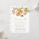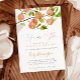 Rustic peach theme gender reveal party invitation card featuring illustration of the garden fruit on a tree branch. Perfect for a party in summer. The text says "what will our little peach be?"