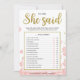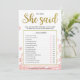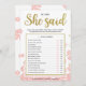 This modern floral "He Said She Said" bridal shower game features a pink floral background with golden glitter splashes. The text is written in a mix of a playful calligraphy font and a modern sans font, this He Said She Said card is personalised with the Bride-to-be name and the Bridal Shower date.