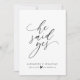 This save the date/engagement announcement features the phrase "He said yes" in a modern simple black handwritten script with details underneath and a black watercolor background on the back.