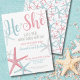 Welcome friends and family of the parents to a summer or beach themed gender reveal party to find out if the couple is having a boy or girl! A cute and trendy watercolor starfish beach pattern, boasting a blend of captivating pink and blue or teal shades reminiscent of a beach house paradise. Embrace the essence of summer with this coastal-inspired design, adorned with whimsical sea stars that exude a nautical charm. Pink And Blue He Or She What Will Baby Be Beach Theme Summer Gender Reveal Party Invitation
