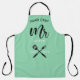 Trendy Apron for newly established hubby. Perfect as a gift. Design featuring ''Mr'' calligraphy script, head chef and cooking appliances. Personalise with a name and year established.