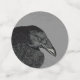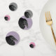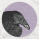 This table confetti has an illustration of the head and face of a black crow on various colours of purple, grey, and pink.