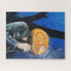 A spooky, Halloween jigsaw puzzle featuring the pastel artwork, “The Headless Biker”. This illustration features a pumpkin-head ghost wearing a leather jacket smoking a cigarette on a cold, dark October night. Original artwork: Pastels on paper. Copyright Dominic A. White. All rights reserved.