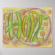 The inspirational word "Hope" is both drawn and painted in a soft green colour. Behind the word are pale pastel pink and yellow circles and swirls. The original art was created using watercolor pencils on paper. Use this art to help bring a healing intention and focus. Inspirational artwork by Laurel Latto for DonnaBellas Angels.