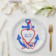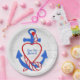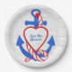 Red and blue heart nautical anchor with rope graphic on rustic whitewashed wood background.