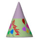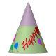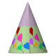 Pretty heart balloon birthday party hats. Celebrate a 1st birthday or personalise for any age with these festive colourful flying heart balloons in red, pink, blue, lavender, yellow, green with the look of sprinkles outlining balloons. Happy Birthday is written in red text on sides of balloons. Shown with a two-tone lavender and light green background. Fun birthday party celebration hats for kids or adults. Original Graphic Artwork design © 2013, 2016 TamiraZDesigns.