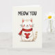This card shows a chubby white cat centered on a soft off-white background, looking straight ahead as if locking eyes with someone it adores 🥰. A bright scarlet scarf is tied around its neck, with two little fringed ends that add a cozy, cuddly touch. The cat’s paws wrap around a large deep red heart held close to its chest, making the affectionate gesture the main focus ❤️. Its face is kept simple with tiny black dot eyes, a small brown nose, a gentle smile, and rosy pink cheeks that read like a shy blush. Light shading and faint outlines give the fur a soft, velvety look without adding heavy detail. Near the top, the phrase “MEOW YOU” sits above the cat in thick black hand-drawn letters, clearly standing out against the pale background. The palette stays mostly creamy whites and warm browns, letting the reds of the scarf and heart pop. The scarf’s knot and the heart’s rounded edges are drawn with smooth curves and minimal lines.
