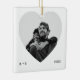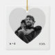 A modern white square ceramic ornament with a large heart-shaped photo window. Clean, typewriter micro text balances the design (initials at left, year at right) while the monochrome look flatters any couple photo. Edit the initials and year to mark engagements, anniversaries, or a favourite holiday snapshot—an elegant keepsake for the tree or gift box.
