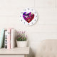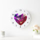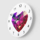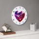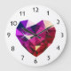 Wall clock with a big heart shaped red and purple gemstone on white background.