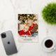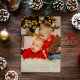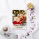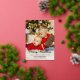 Double sided Christmas card personalised with three photos, one on the cover and two on the back. Gold foil photo Christmas card with your photo covering the card and Merry Christmas and a happy new year in gold foil lettering with a heart and greenery divider.
