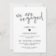 A black and white engagement party invitation with "we are engaged" in a hand-writing font. A small doodled heart joins your names written in a modern script. Add a photo to the back of the invitation.