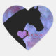 A black silhouette of a horses head on a purple/blue background with a purple heart and the word "horses". Which means "Heart horses or "Loves horses".