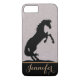 A silvery mauve background with a smoky mist design with the black silhouette of a horse. Personalise with your name. Have more than one case to suit your style or mood for the day! Designed by Robin Cox.