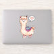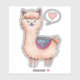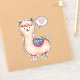 Cute watercolor painting of a whimsical tan llama with a multi coloured patterned cloth on its back. To the right is a speech bubble with a cute pink heart inside.
