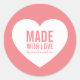 Modern round sticker with the words "Made with Love" in bold font and a stylish script for your name or store name against a white heart. Use this sticker for wrapping and packaging of things like handmade goods. This versatile sticker has an editable background colour (change it to whatever you like) and change font colour to match as well which you can access by clicking "customise" button.