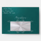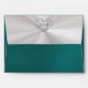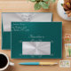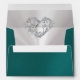 This design features a teal background with a silver scroll heart on a white pearl background on the inside flap and a heart monogram on white pearl on back flap. Personalize the return address on front and the heart on inside flap can easily be replaced or removed if prefer. Available with different colors for your wedding theme colors. Designed to coordinate with the "Romantic Scroll Hearts & Calligraphy" Wedding Collection. To change details, click «Personalize». To move the text or change the text size, font, or color click «Click to customize further»