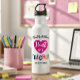 Heart of a Teacher Gift Pink Black Script Water Bottle. The letters for heart are within the word "teacher". Fun design in a modern script font to customize for you or your child's teacher. Let them know they are appreciated with a thoughtful custom gift. Personalizre the teacher's name, the school year or current year, and name of the child. Text is editable, delete any text you wish to remove. Design is original to Cross Fox Design.