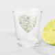 A heart-shaped arrangement composed of various clovers, perfect for St. Patrick's Day or any celebration of good luck. The clovers are of different sizes and designs, including plain green, leopard print, and green and yellow stripes. The clovers are densely packed in the centre and gradually spread out towards the edges, creating a visually striking heart shape. Small green dots are scattered around the clovers, adding to the decorative effect. This shot glass design captures the spirit of luck and charm with a touch of creativity and style.