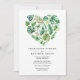 Invite guests to your summer, destination or beach wedding with these tropical chic wedding invitations featuring an heart of tropical leaves in green watercolor. Cards reverse to solid green for a chic tropical look.