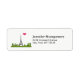 Address labels with a whimsical drawing of the Eiffel Tower in the background surrounded by green trees. A pink watercolor heart floating in the air adds a girly flair.